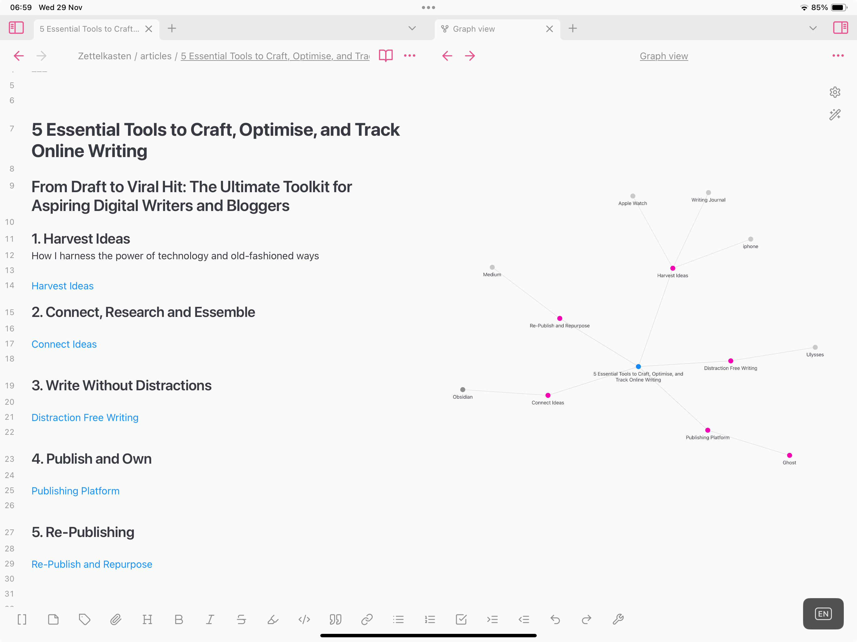 As it is based on pure text files, I can trust it 100%. My collected ideas end up here, as well as any references I might need. Using Obsidian, I connect my thoughts and ideas. I shape the bones of my article.