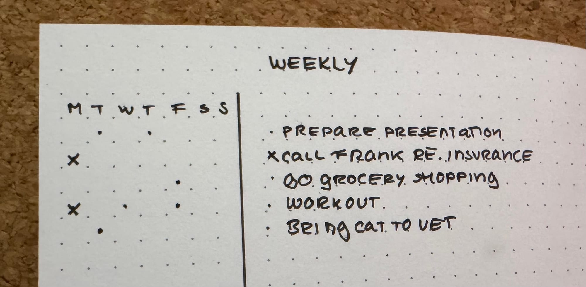 This is the foundation. Once you do a task, you mark it off. In this example a x represents a task that is done.